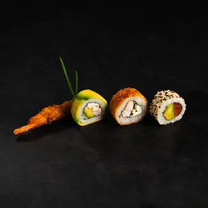 10 (Pollo teriyaki - queso crema - envuelto en sésamo) 10 (Kanikama - palta - envuelto en sésamo) 10 (Salmón - queso crema - envuelto en palta) 10 (Pollo teriyaki - palta - envuelto en queso crema) 10 (Camarón - queso crema - cebollín - envuelto en masa tempura) 10 (Pimentón - queso crema - cebollín - envuelto en masa tempura)