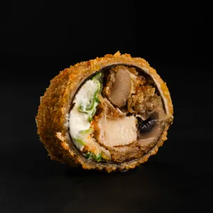 Champiñon apanado - pollo apanado - queso crema - cebollín - envuelto en pollo apanado