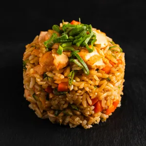 Arroz salteado con verduras, una proyeína a tu elección y salsa de soya